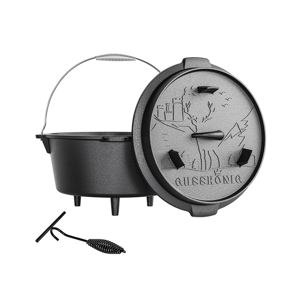 Entdecke den Gusskönig Dutch Oven Robust und langlebig, perfekt für Braten, Schmoren, Backen und Frittieren über Feuer, Kohlen, Herd oder Gasgrill.