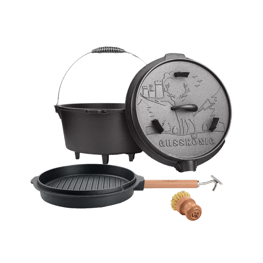 Der 9-Liter-Dutch Oven von Gusskönig steht für Innovation. Er verfügt über erhöhte Füße für mehr Platz für die Kohlen. Mit dem cleveren Deckelheber ist das Öffnen ohne Handschuhe einfach und sicher. Zudem dient der Deckel als Pfanne. Eine absolute Empfehlung für jeden Outdoor-Kochliebhaber!