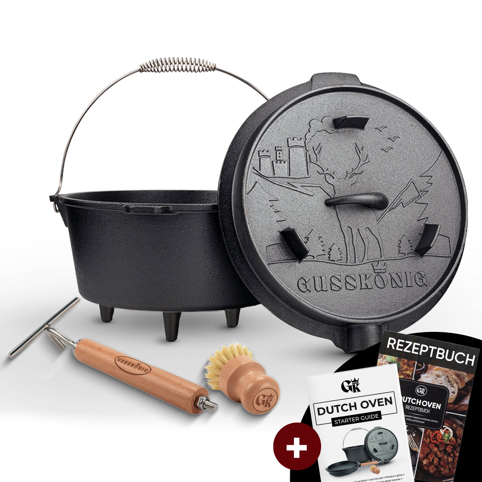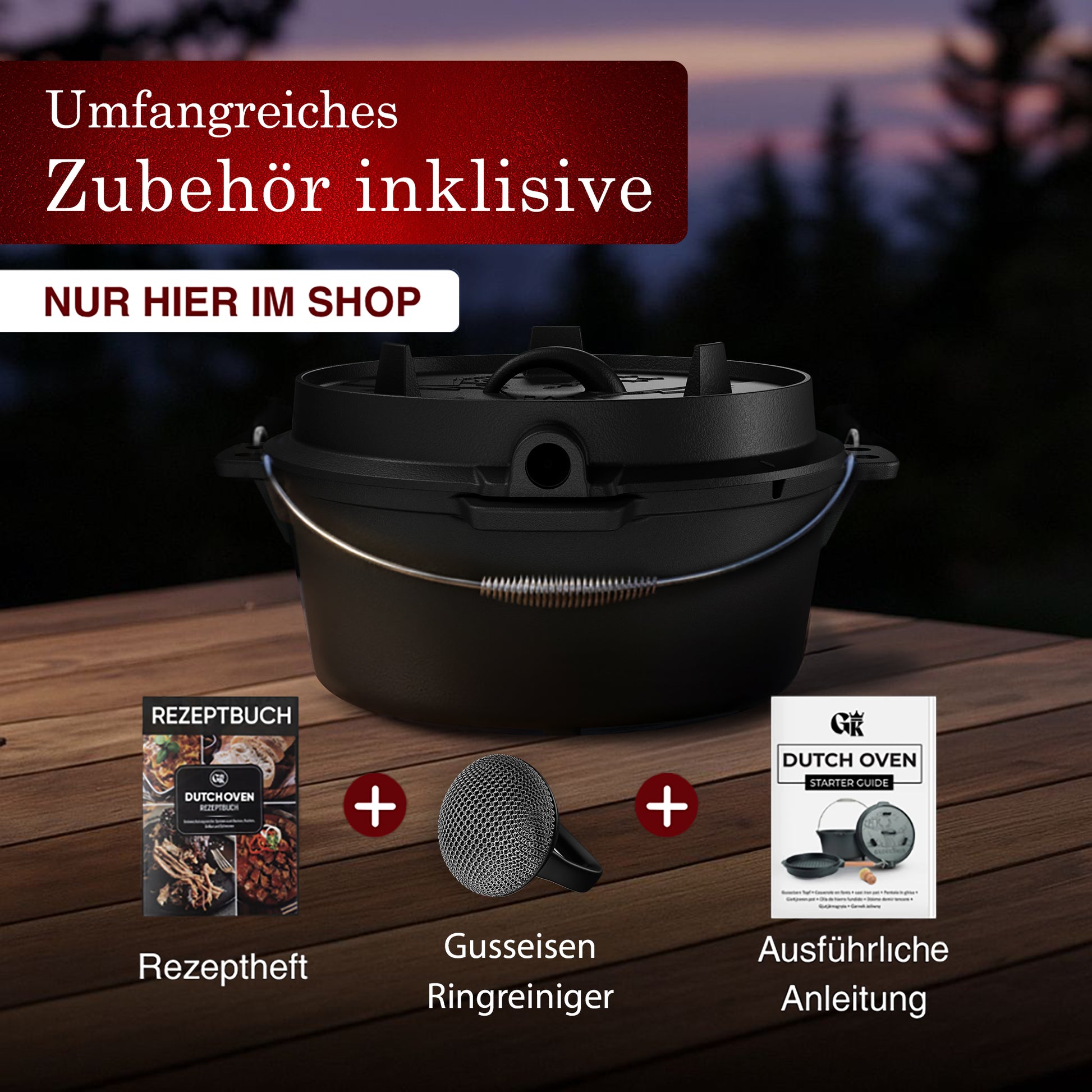 Der Dutch Oven ist bereits eingebrannt und sofort einsatzbereit. Das beiliegende Rezeptheft und die Pflegeanleitung machen den Einstieg leicht, auch für Neulinge. So gelingt jedes Gericht, egal ob Backen, Schmoren, Braten, Kochen oder Grillen.