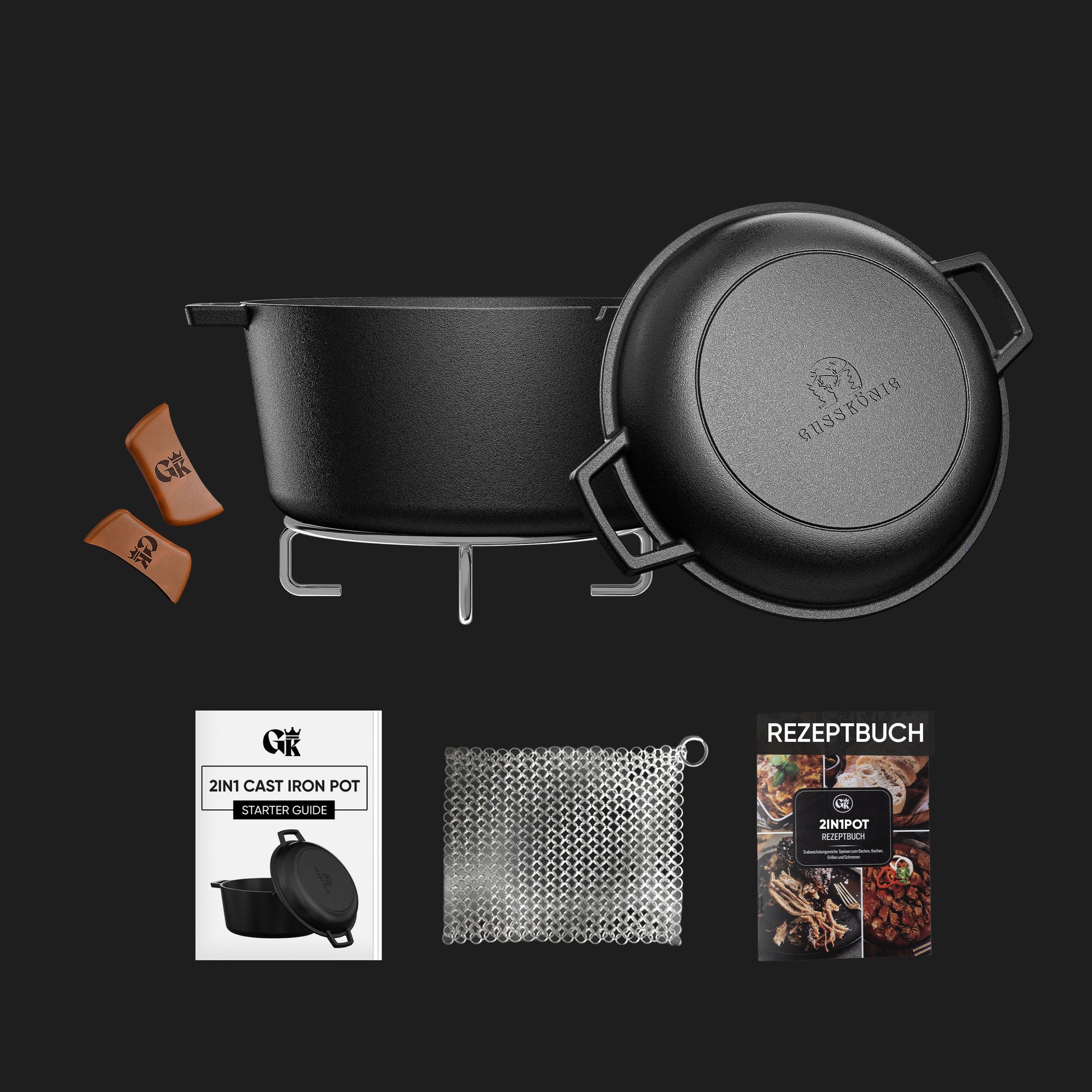 DUTCH OVEN ZUBEHÖR: Unser umfangreiches Dutchoven Set hat folgendes zu bieten: 2x Echtleder Griffe zum Anheben des Deckels, einen Ringreiniger aus Edelstahl, einen Edelstahl Untersetzer und ein Dutch Oven Rezeptbuch mit vielen abwechslungsreichen Rezeptideen!