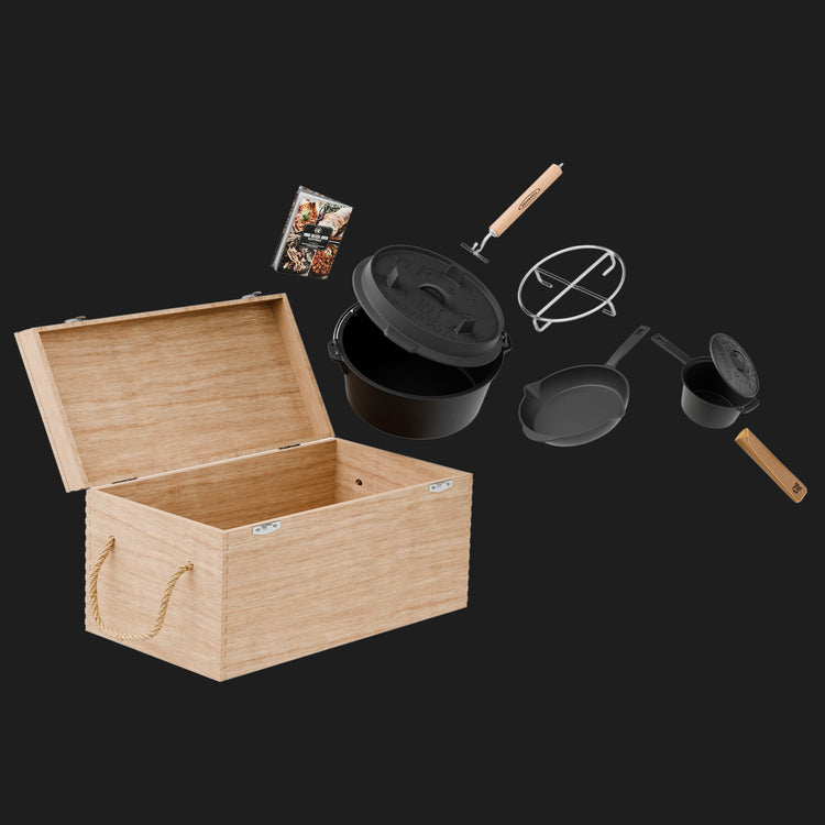 Enthält alles, was du für ein gelungenes Kocherlebnis benötigst: Dutch Oven, Bratpfanne, Saucentopf, Griffschutz aus echtem Leder, Edelstahl-Untersetzer sowie einen praktischen 2in1-Deckelheber. Geliefert wird das Set in einer erstklassigen Massivholzbox!Dein Dutch Oven BBQ-Set ist bereits eingebrannt und somit sofort einsatzbereit. Im Unterschied zu vielen anderen Produkten auf dem Markt kannst du unseren Feuertopf direkt verwenden, ganz ohne vorherige Vorbereitung!Die hochwertige Holzkiste dient nicht nur als sicherer Aufbewahrungsort, sondern überzeugt auch optisch. Sie schützt das Set optimal und punktet mit durchdachten Details wie dem 2in1-Deckelheber – ein rundum gelungenes Geschenk!Ob Schmoren, Braten oder Grillen – unser Dutch Oven Gusseisen-Set ist ein wahres Multitalent und passt zu jeder Kochsituation. In unserem Rezeptbuch findest du zahlreiche hilfreiche Tipps und Tricks für deinen neuen Feuertopf!