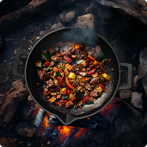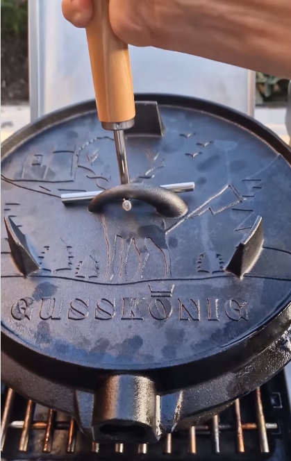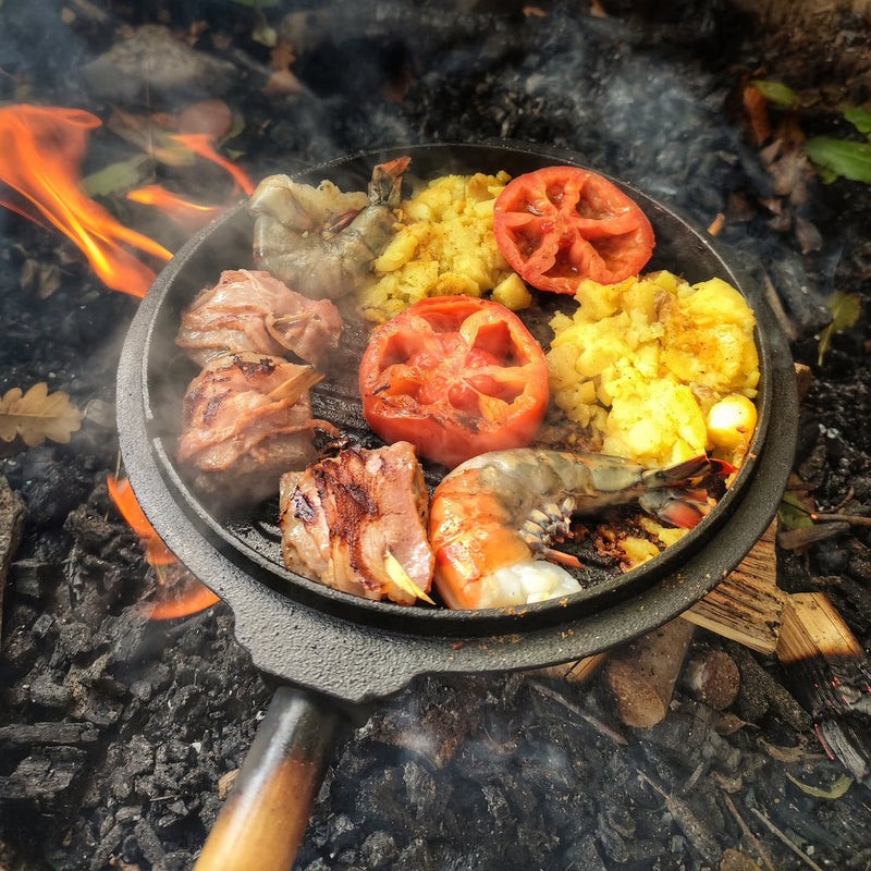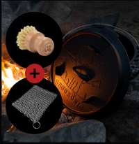 Der Holzgriff dient als sicherer Deckelheber und zugleich als Pfannenstiel, wenn du den Deckel separat z.B. zum Braten nutzt. Das vereinfacht das Handling am Grill oder am Feuer und spart separates Grillbesteck oder zusätzliche Pfannen.
