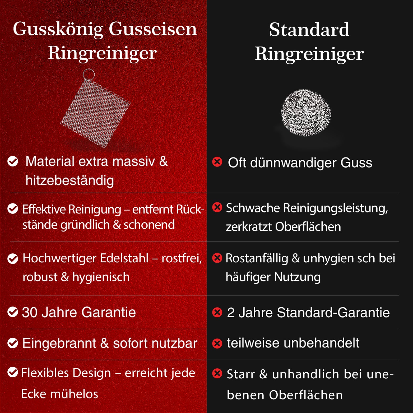 Nach dem Kochen mit heißem Wasser ausspülen und mit dem beiliegenden Ringreiniger säubern. Anschließend dünn mit Pflegepaste einreiben.