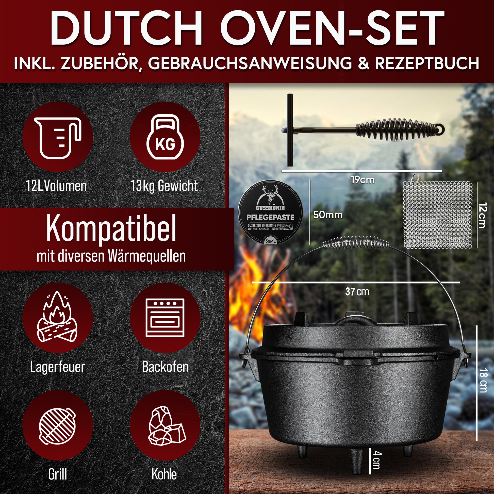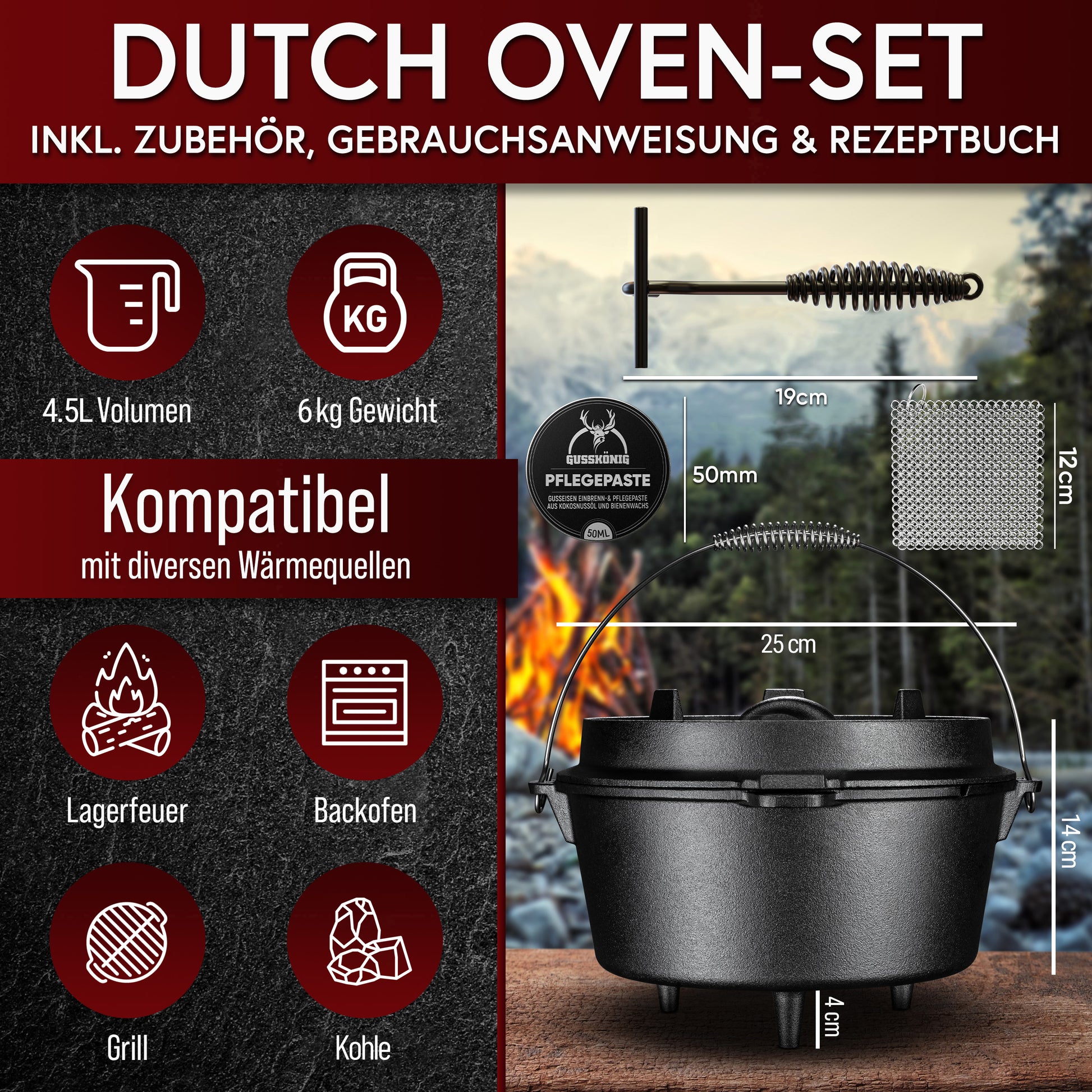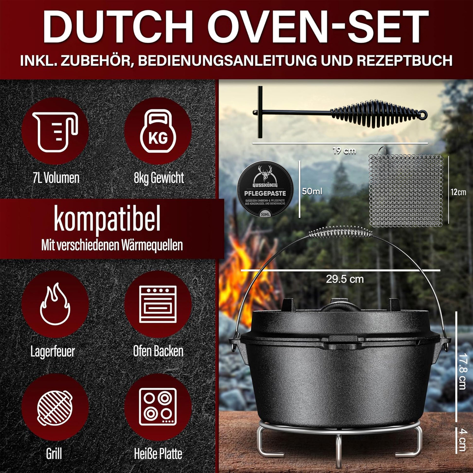 Nur hier im offiziellen GUSSKÖNIG Shop erhältst du zusätzlich ein Pflegeset mit Pflegepaste und Edelstahl-Ringreiniger. Damit bleibt dein Dutch Oven sauber und geschützt.